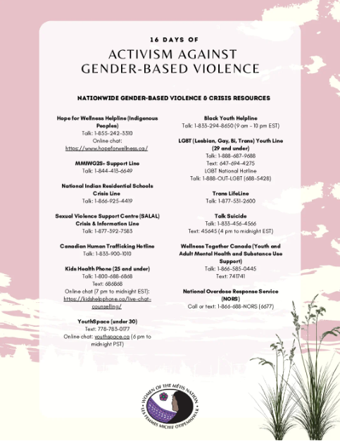 A list of crisis resources specific to Indigenous women with some Metis-specific resources.